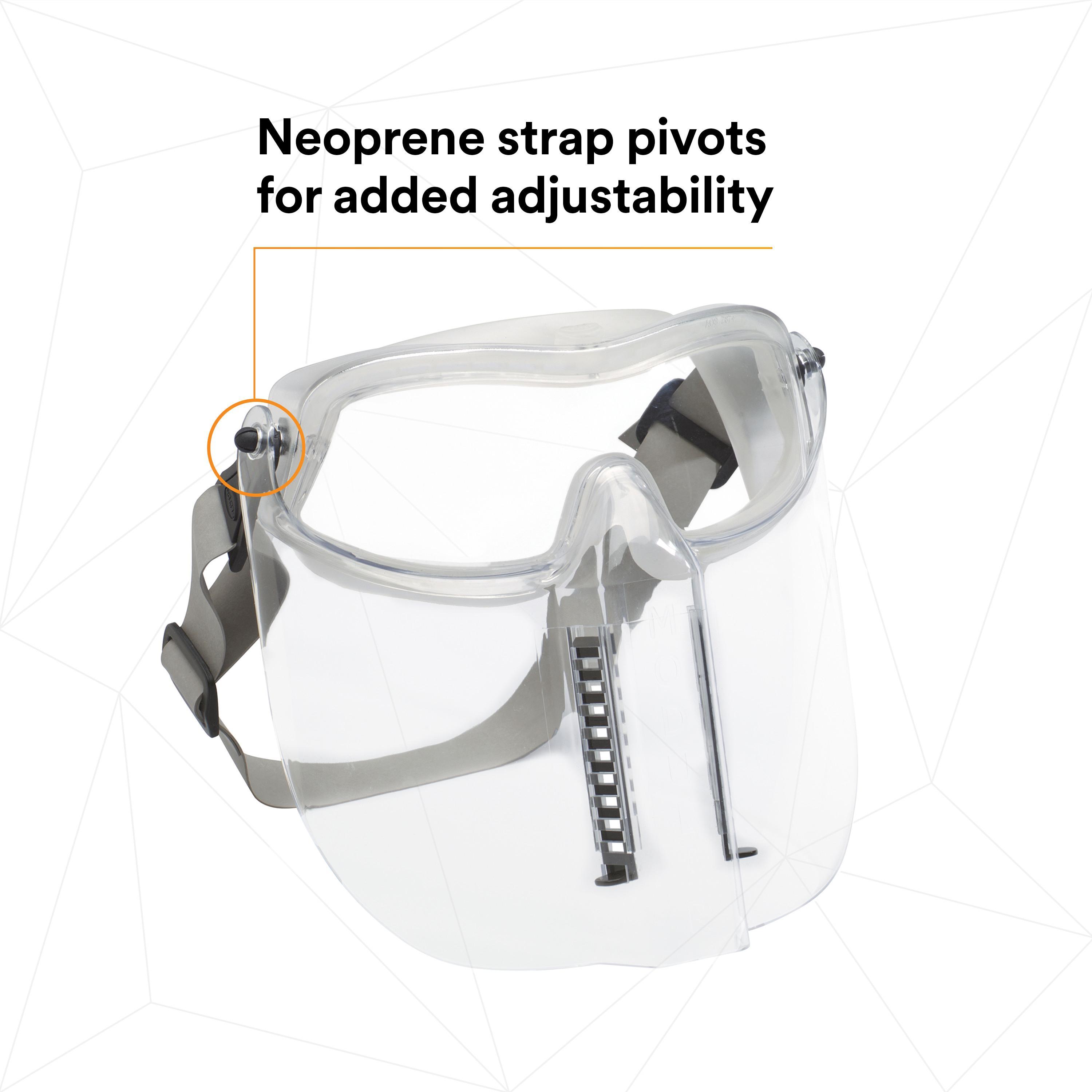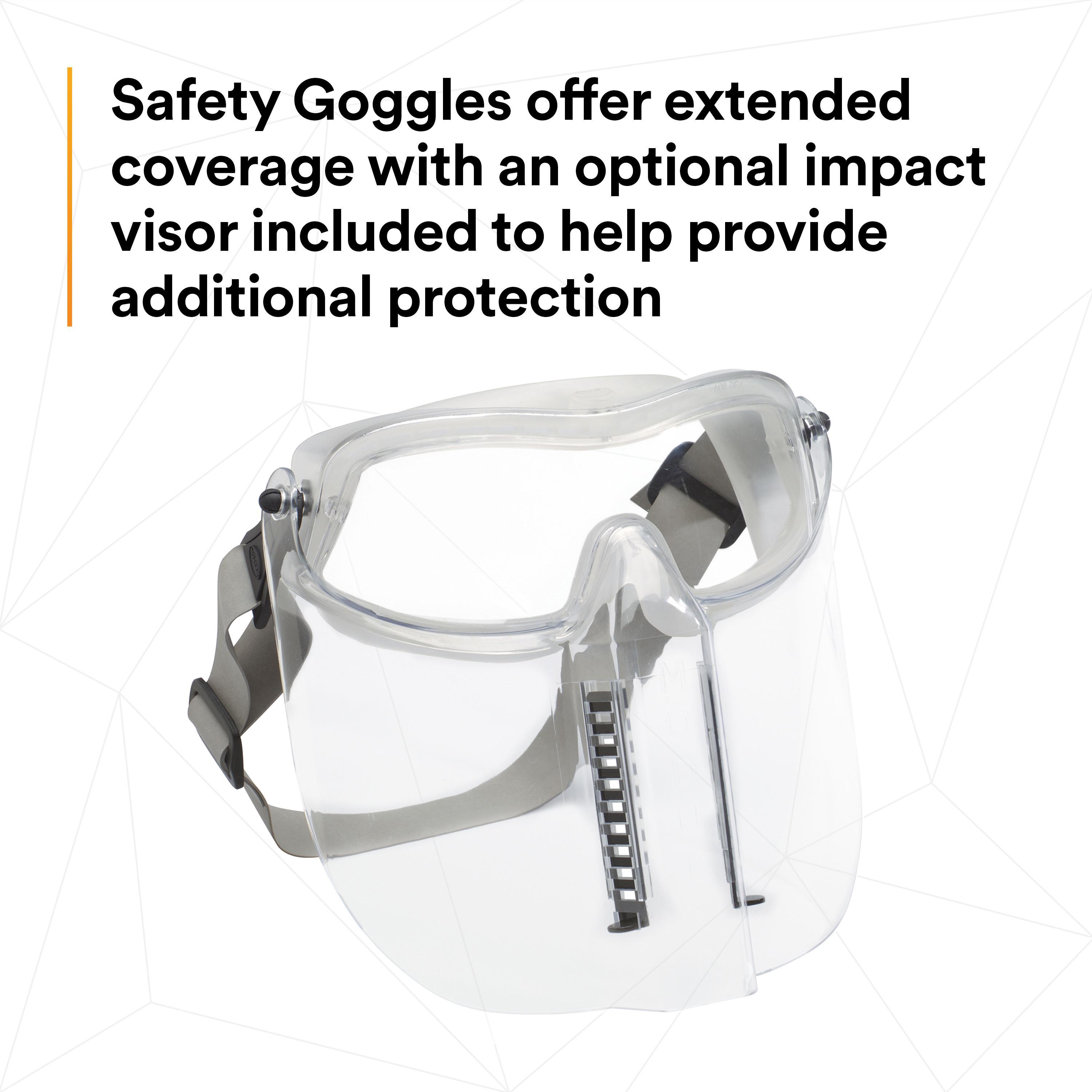 The 3M™ Modul-R™ Safety Goggles offer extended coverage with an optional impact visor included to help provide additional protection. An open or closed venting system helps minimize fogging and can be flipped up in stand-by position.