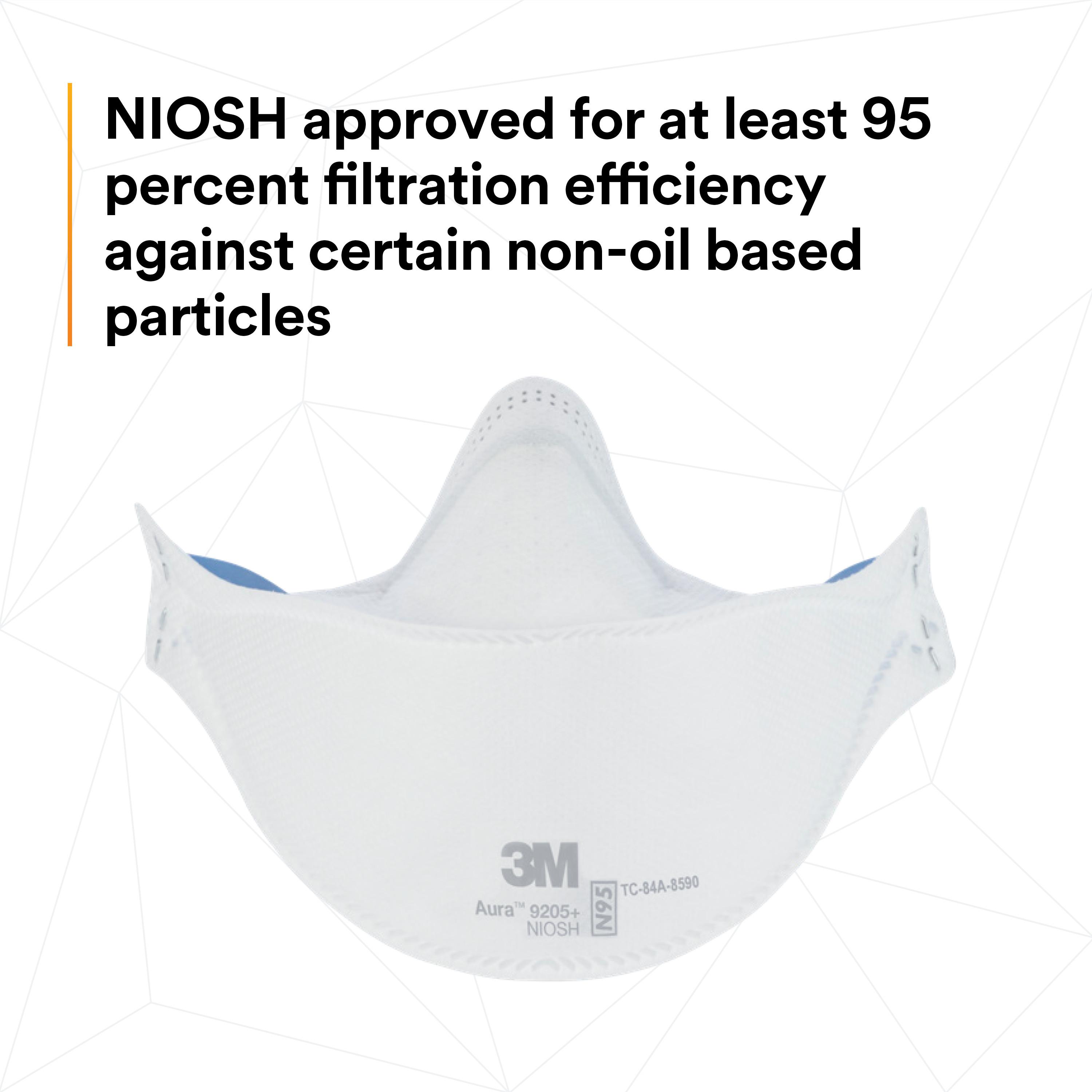 3M Particulate Respirator 9205+, N95 is a disposable particulate respirator that is designed to help provide reliable respiratory protection of at least 95 percent filtration efficiency against certain non-oil based particles. The lightweight, three-panel designed respirator helps provide quality, reliable, and convenient worker respiratory protection. 3M uses a variety of innovative technologies and features to help you meet your respiratory protection and comfort needs. 3M`s proprietary filter media, 3M™ Advanced Electret Media, filters dust and other particles, while allowing for easy breathing. The soft inner material provides added comfort while the soft nose foam and adjustable nose clip help provide a custom seal. Unique features to the Aura Series Particulate Respirators include: sculpted nose panel that follows the contours of your nose allowing more room for eyewear, embossed top panel that is designed to help reduce the fogging of eyewear from warm, moist exhaled air, and innovative chin tab designed for ease of positioning, donning, and adjustment. The unique three-panel flat fold design is collapse resistant and its individual packaging allows for easy storage prior to use. Warning: Respirators help protect against certain airborne contaminants. Before use, the wearer must read and understand the User Instructions provided as a part of the product packaging. Follow all local regulations. In the U.S., a written respiratory protection program must be implemented meeting all the requirements of OSHA 29 CFR 1910.134 including training, fit testing and medical evaluation. In Canada, CSA standards Z94.4 requirements must be met and/or requirements of the applicable jurisdiction, as appropriate. Misuse may result in sickness or death. For correct use, consult supervisor and User Instructions, or call 3M Personal Safety Division (PSD) Technical Service in the U.S.A. at 1-800-243-4630. In Canada, call 1-800-267-4414. Disclaimer: 3M industrial and occupational products are intended, labeled, and packaged for sale to trained industrial and occupational customers for workplace use. Unless specifically stated otherwise on the applicable product packaging or literature, these products are not intended, labeled, or packaged for sale to or use by consumers (e.g., for home, personal, primary or secondary school, recreational/sporting, or other uses not described in the applicable product packaging or literature), and must be selected and used in compliance with applicable health and safety regulations and standards (e.g., U.S. OSHA, ANSI), as well as all product literature, user instructions, warnings, and limitations. Misuse of 3M industrial and occupational products may result in injury, sickness, or death. For help with product selection and use, consult your on-site safety professional, industrial hygienist, or other subject matter expert.