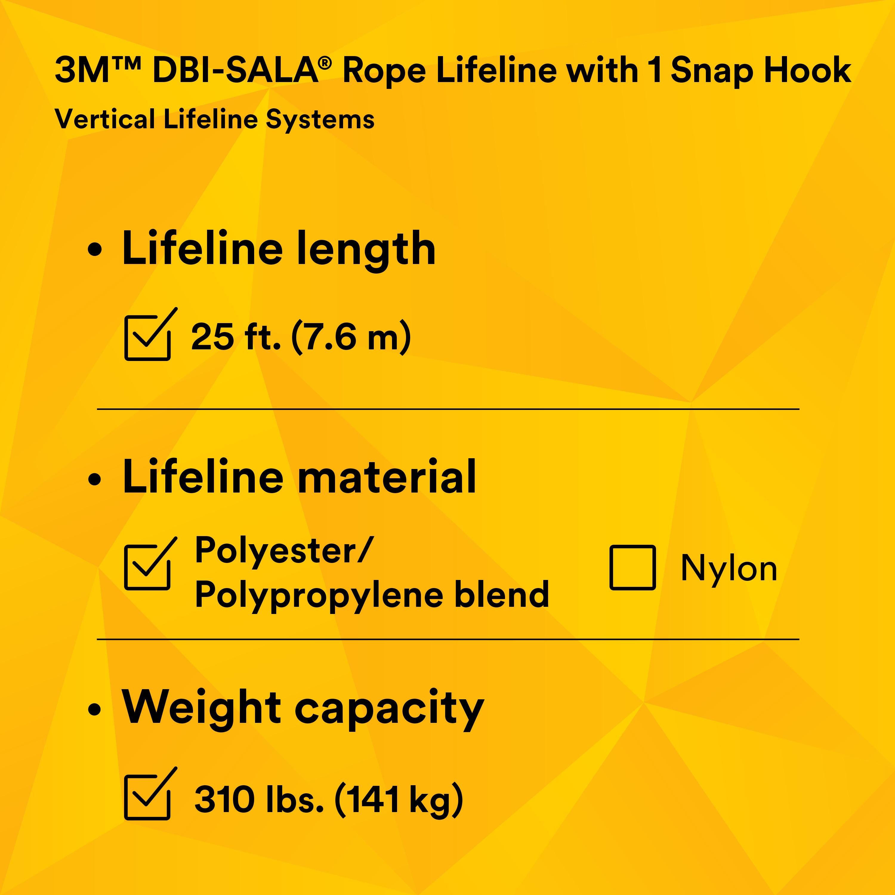 3M™ DBI-SALA®, 7100204288, Lifeline with Snap Hook, Rope, Series: 1202742, 310 lb Load, 25 ft Length, Polyester Line, Specifications Met: ANSI A10.32, ANSI Z359.1, OSHA 1910.66, OSHA 1926.502