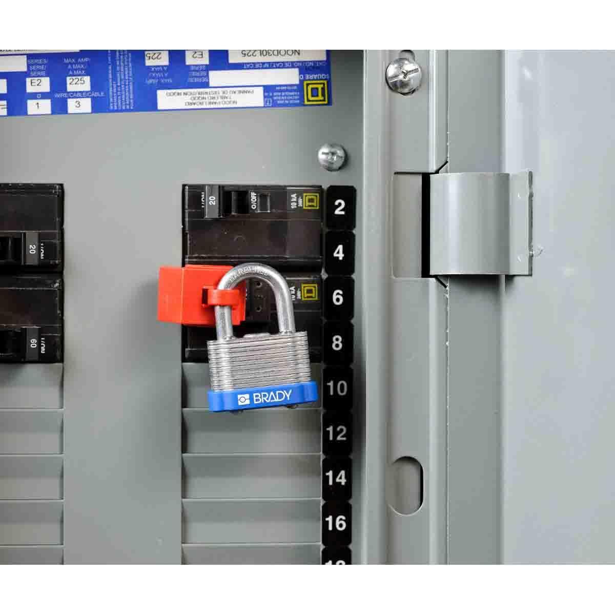 Brady® 65396 1-Pole Clamp-On Circuit Breaker Switch Lockout Device, For Use With 120/277 V AC Single Pole and Internal-Trip Multi-Pole Breaker, 1 Padlocks, 0.31 in Dia Max Padlock Shackle, LOTO-14 Polypropylene, Red