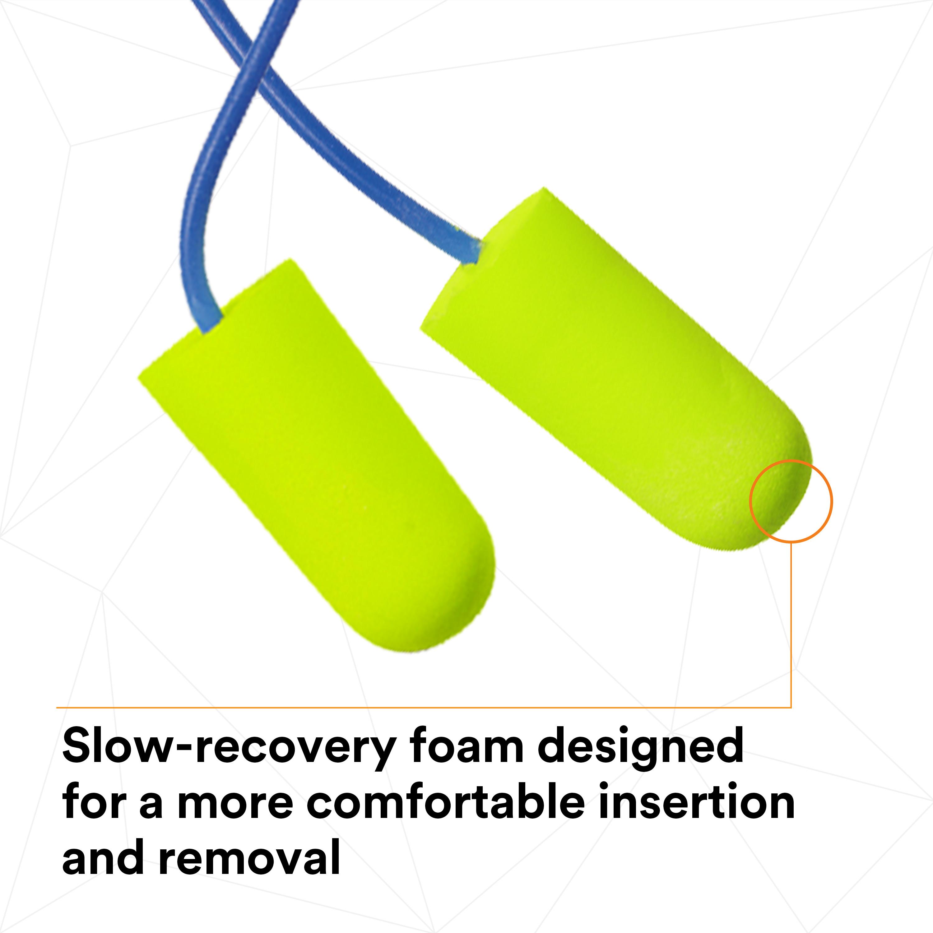 3M™ E-A-Rsoft™ Yellow Neons™ Earplugs feature a tapered shape and smooth soft texture for a comfortable fit. This earplug model is made of a soft, slow-recovery foam that also helps make insertion easier. The regular and large size together offer 3M's maximum noise reduction rating for hearing protection.