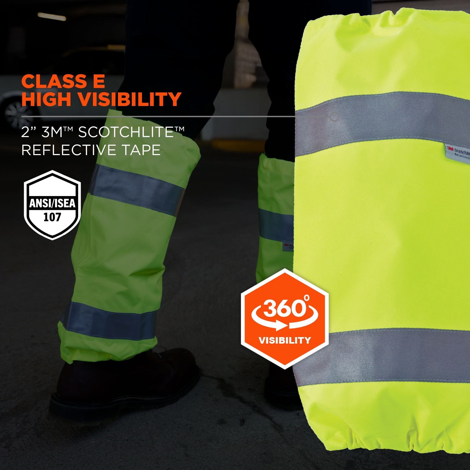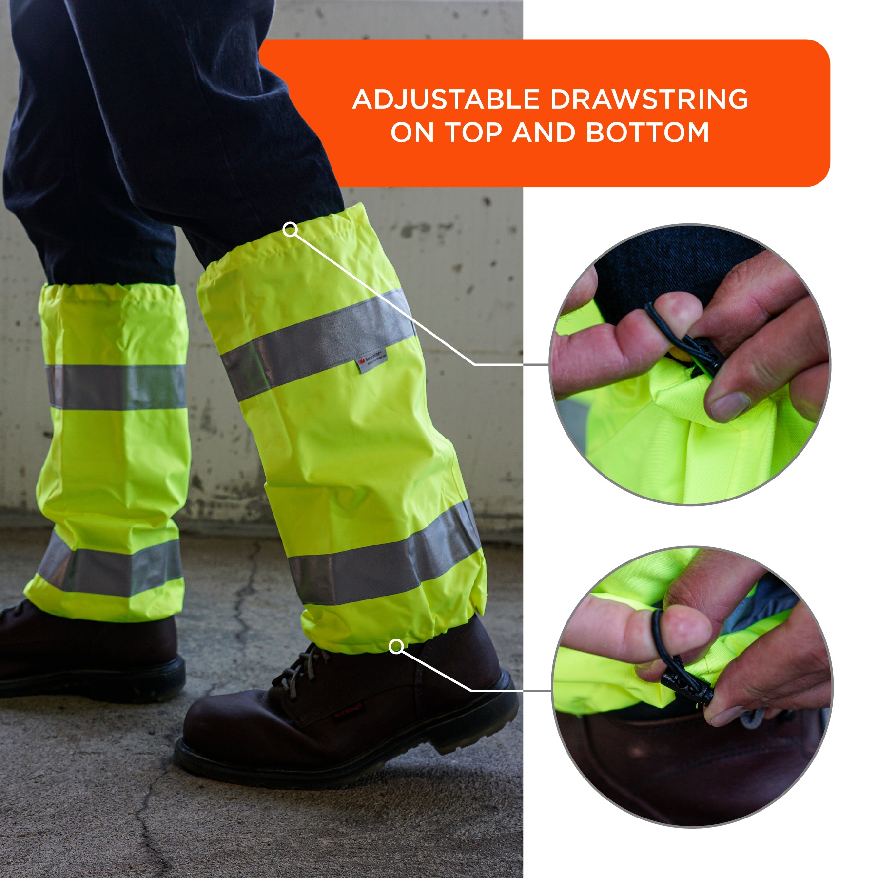 GloWear 8008 Hi-Vis Leg Gaiters meet ANSI/ISEA 107-2020 Class E compliance with 2” 3M™ Scotchlite™ reflective tape, ensuring enhanced visibility in low-light conditions. Built to withstand harsh weather, the durable polyester shell with a PU coating provides reliable protection against rain, snow and wind, while the knee-to-ankle design offers extended coverage protecting pants from mud, debris and elements. For a secure, comfortable fit, these reflective leg gaiters feature adjustable drawstrings, while the oversized opening allows for quick and easy wear over boots. These high visibility leg gaiters are ideal for those working in road construction, transportation, baggage handling, municipalities or around moving vehicles. It's also great for outdoor recreational activities where you need to be seen, such as running or biking.