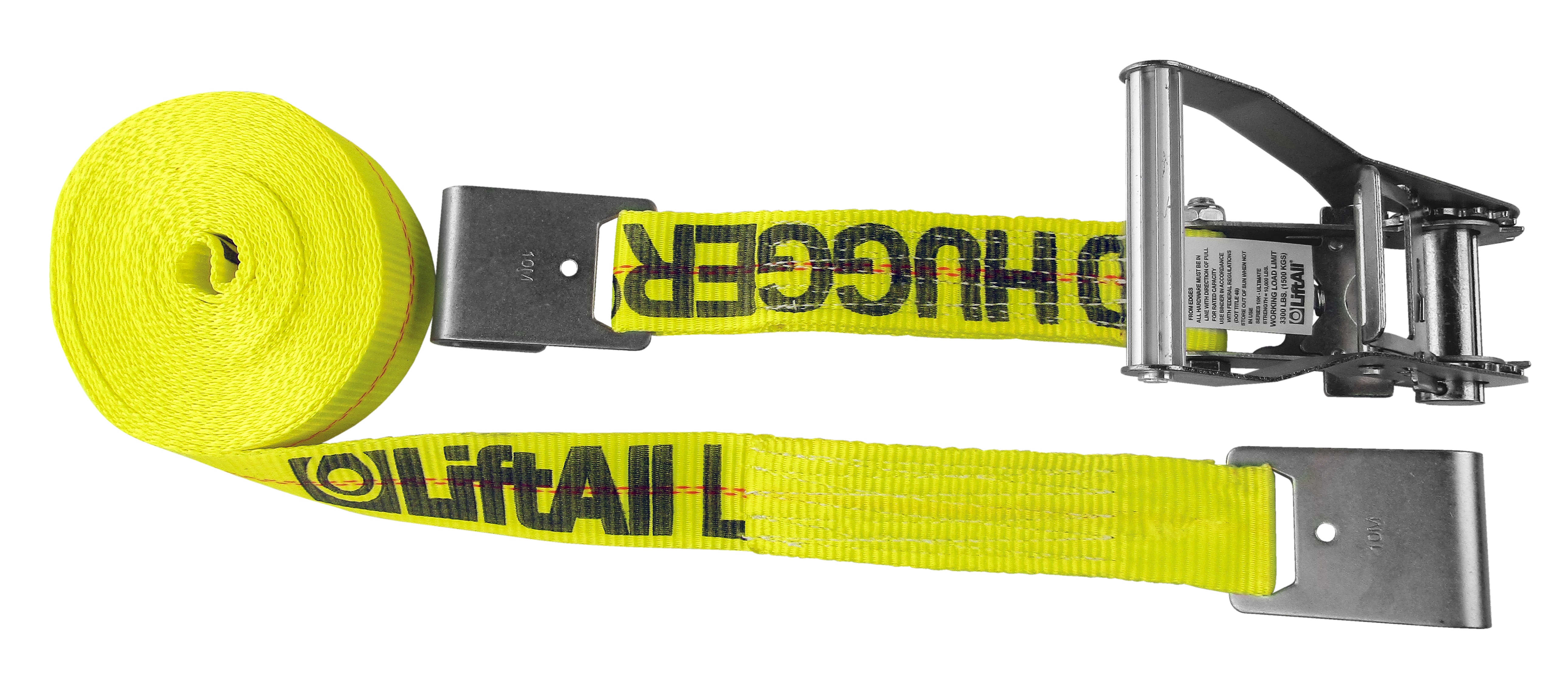 Lift-All® LoadHugger® Winch Strap, 27 ft Strap Length, 2 in Strap Width, 3300 lb Load, 10000 lb Breaking, Polyester Strap, Tiedown Winch Adjustment, Flat Hook, Yellow