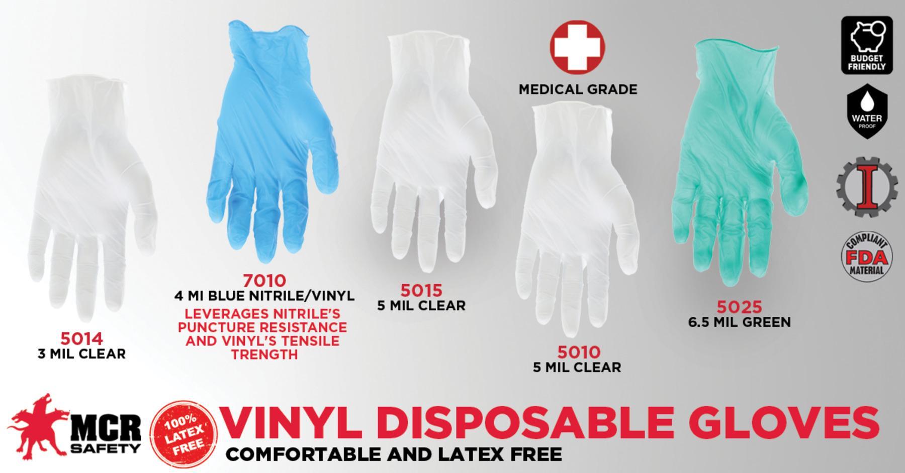 The MCR Safety 5015 SensaGuardTM Non-Sterile Disposable Gloves are made of vinyl material, smooth to the touch and with a thickness of 5 mil. These non-powdered gloves are designed for versatile use in industries such as food processing and light industrial work, and can also come in handy for household cleaning tasks. From washing dishes to handling common cleaning chemicals or hair dyes, these gloves provide ample protection from direct exposure to potentially harmful substances, preventing skin breakouts and illness. In addition, these industrial grade gloves are completely latex-free, making them a great choice for those with allergies or sensitivities.