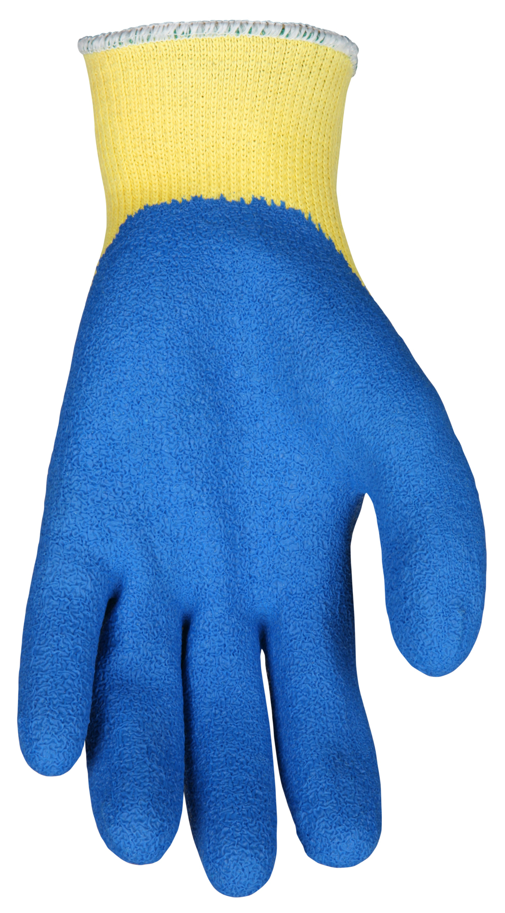 MCR Safety Gloves, Series: FlexTuff® 9687, L, Latex Palm, Crinkle Latex Coating, Kevlar®, Blue/Yellow, Ambidextrous Hand, Standard Finger/Full Finger/Wing Thumb, Kevlar®, Knit Wrist Cuff, 9.84 in Length, ANSI Cut-Resistance Level: A3, ANSI Puncture-Resistance Level: 5, Resists: Abrasion, Cut, Puncture and Tear