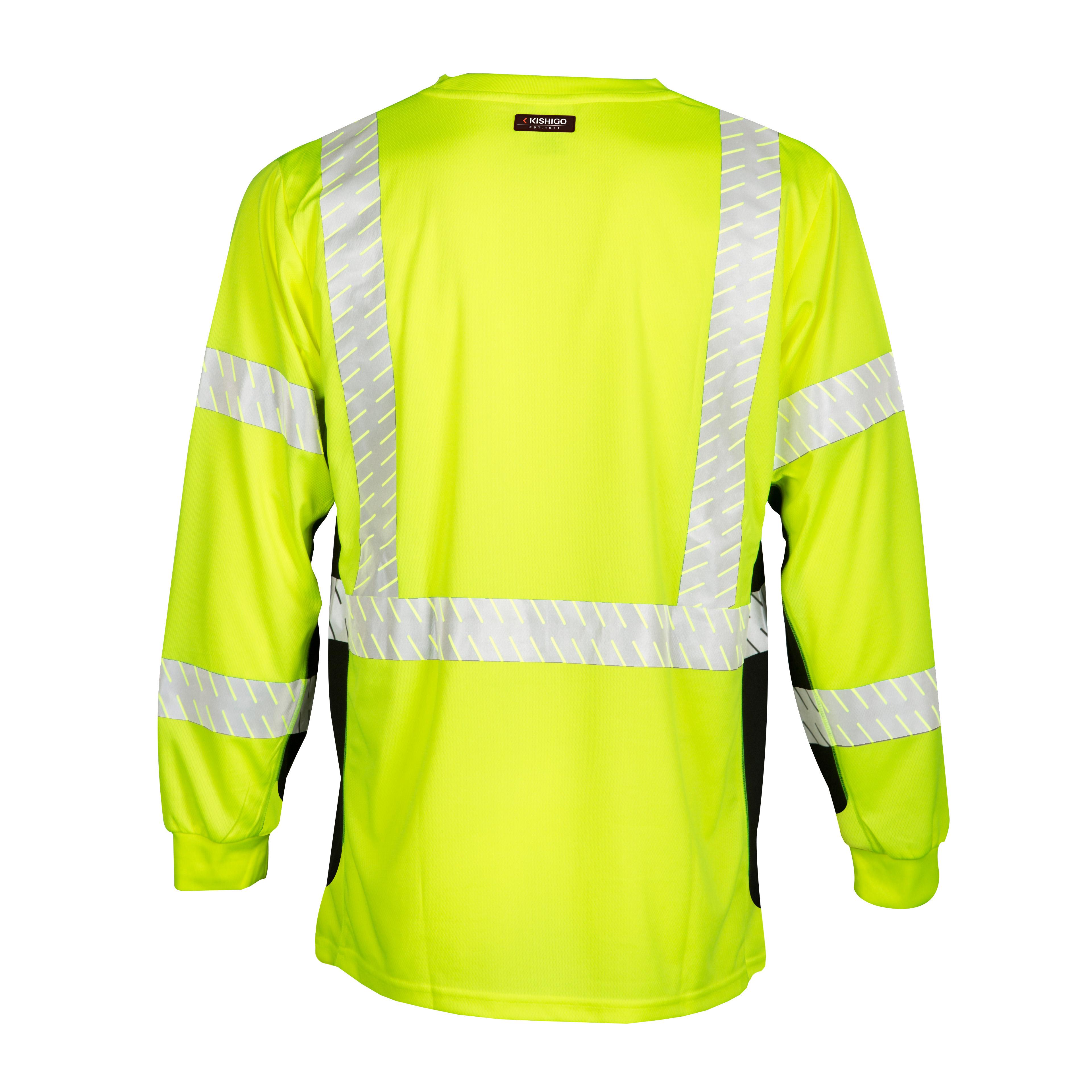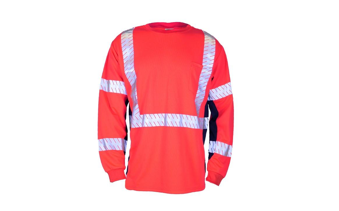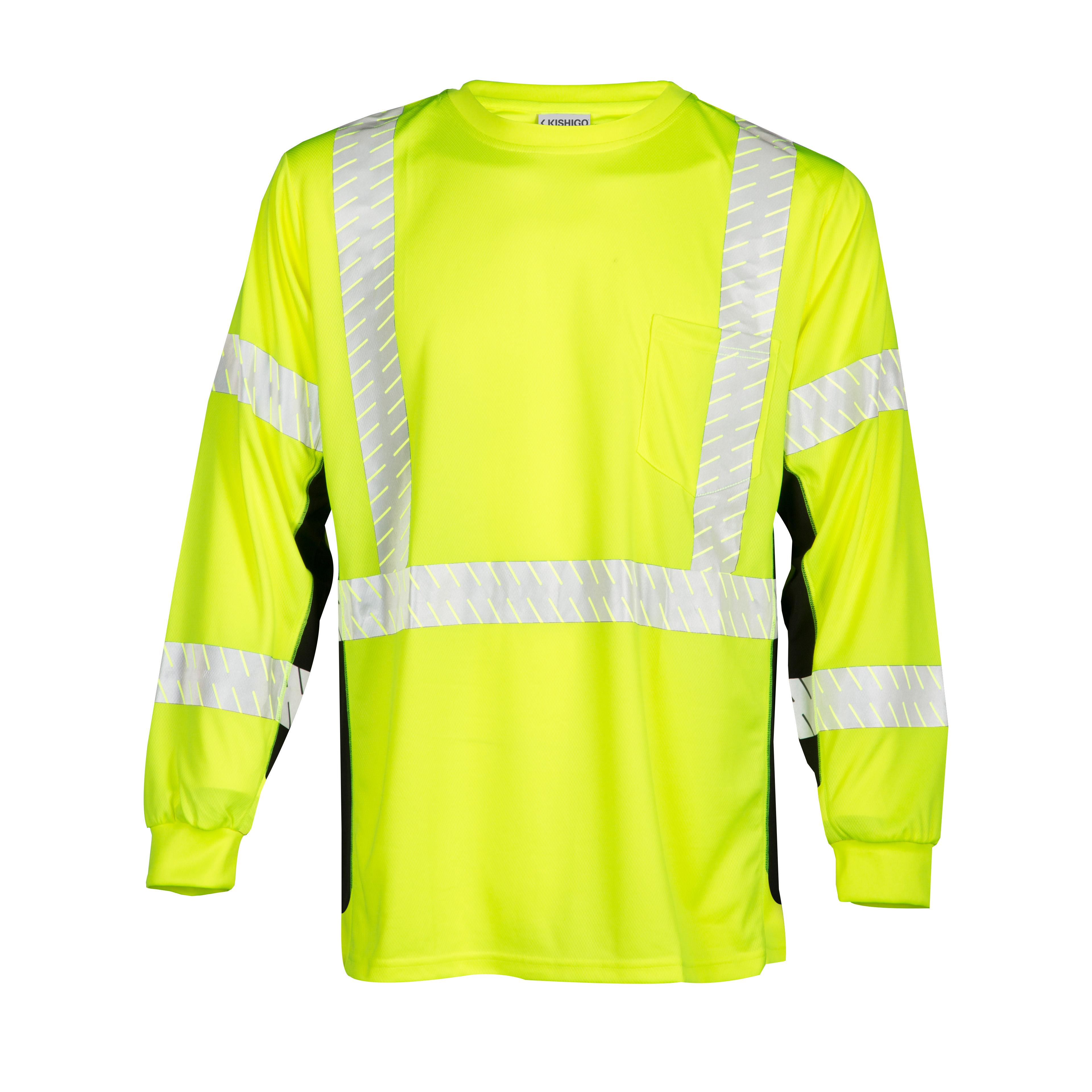 Microfiber polyester material wicks away moisture. 2 wide high performance breathable reflective tape significantly reduces hot spots and provides greater flexibility over solid tapes. Black sides provide contrast and add a sporty look. Left chest pocket.