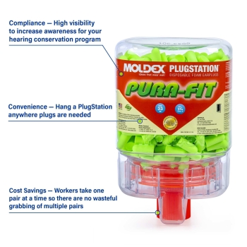 Moldex® Earplugs, Series: Pura-Fit® PlugStation®, Uncorded, 33 dB Noise Reduction Rating, Tapered, Universal, Green Plug, Polyethylene Terephthalate Plug, ANSI S3.19-1974 Specifications Met, Disposable Disposable/Reusable