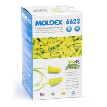 Goin' Green® Corded Foam Earplugs bagged, 100 pairs per box Look for the exclusive colored streaks and swirls as a symbol of Moldex quality. They are made of extra-soft, extra light foam. Their tapered shape fits easily in the ear canal, allowing them to seal gently and snugly. Plus, the outer surface of the earplug is smooth, so it doesn’t irritate the ear canal. They’re so comfortable you’ll forget you’re wearing earplugs. Highest Independently tested NRR 33 dB Made in America