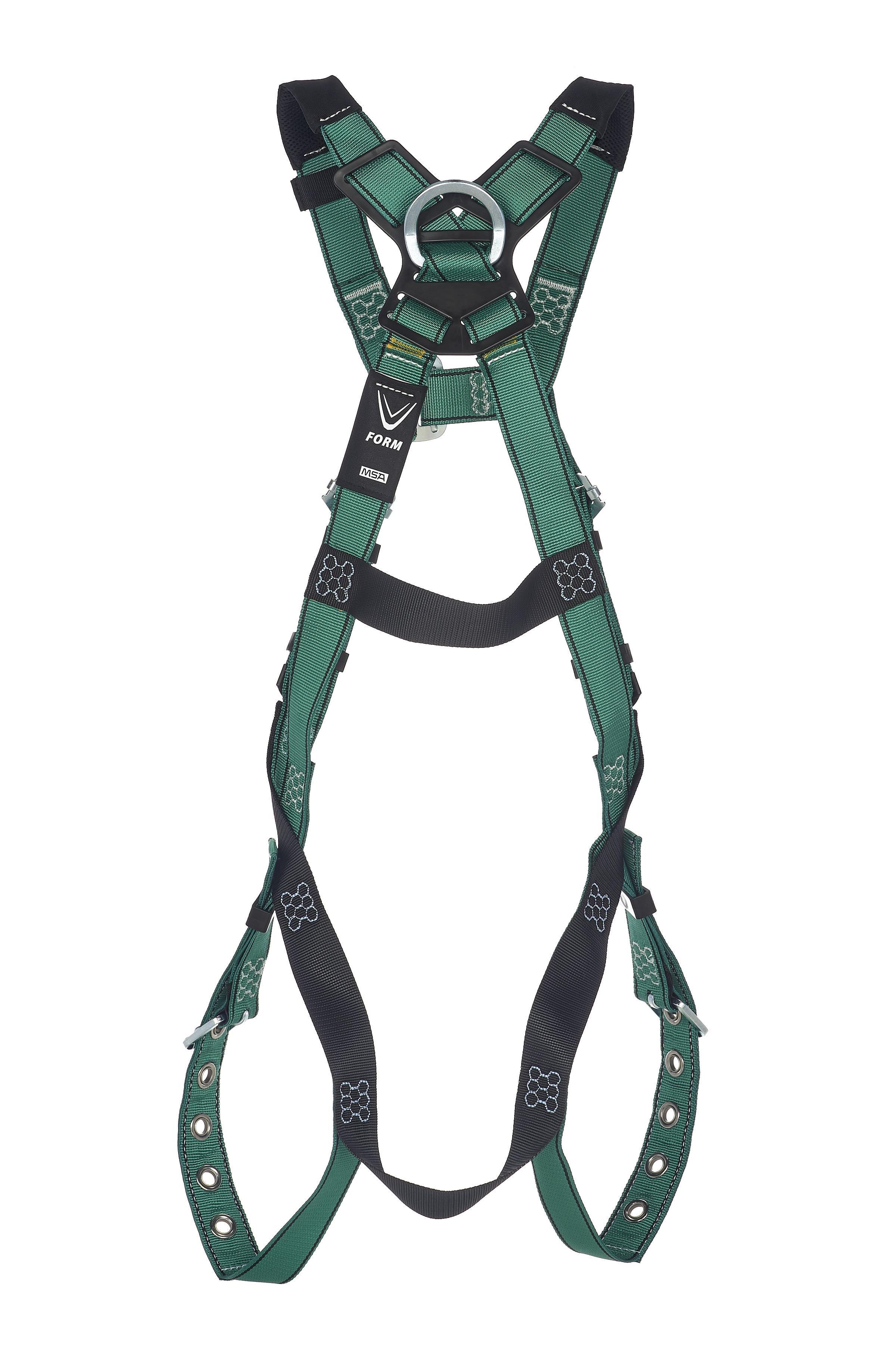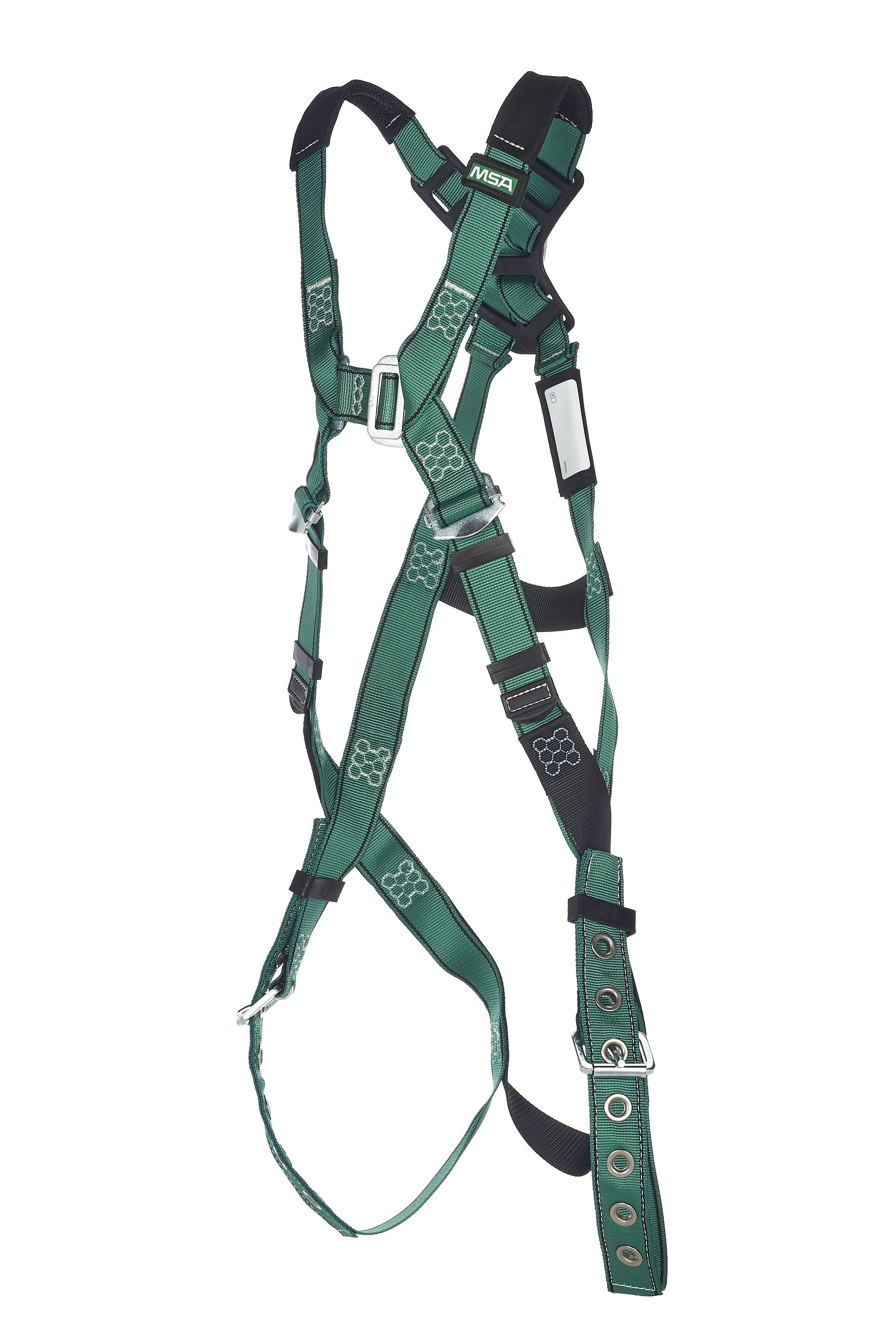 MSA V-FORM, 10196702, Safety Harness, Full Body, XS Size, 130 to 310 lb, 400 lb Load, Tongue Leg Strap Buckle, Quick-Connect Chest Strap Buckle, Polyester Strap, Racing Style, Stainless Steel/Steel Hardware, Green