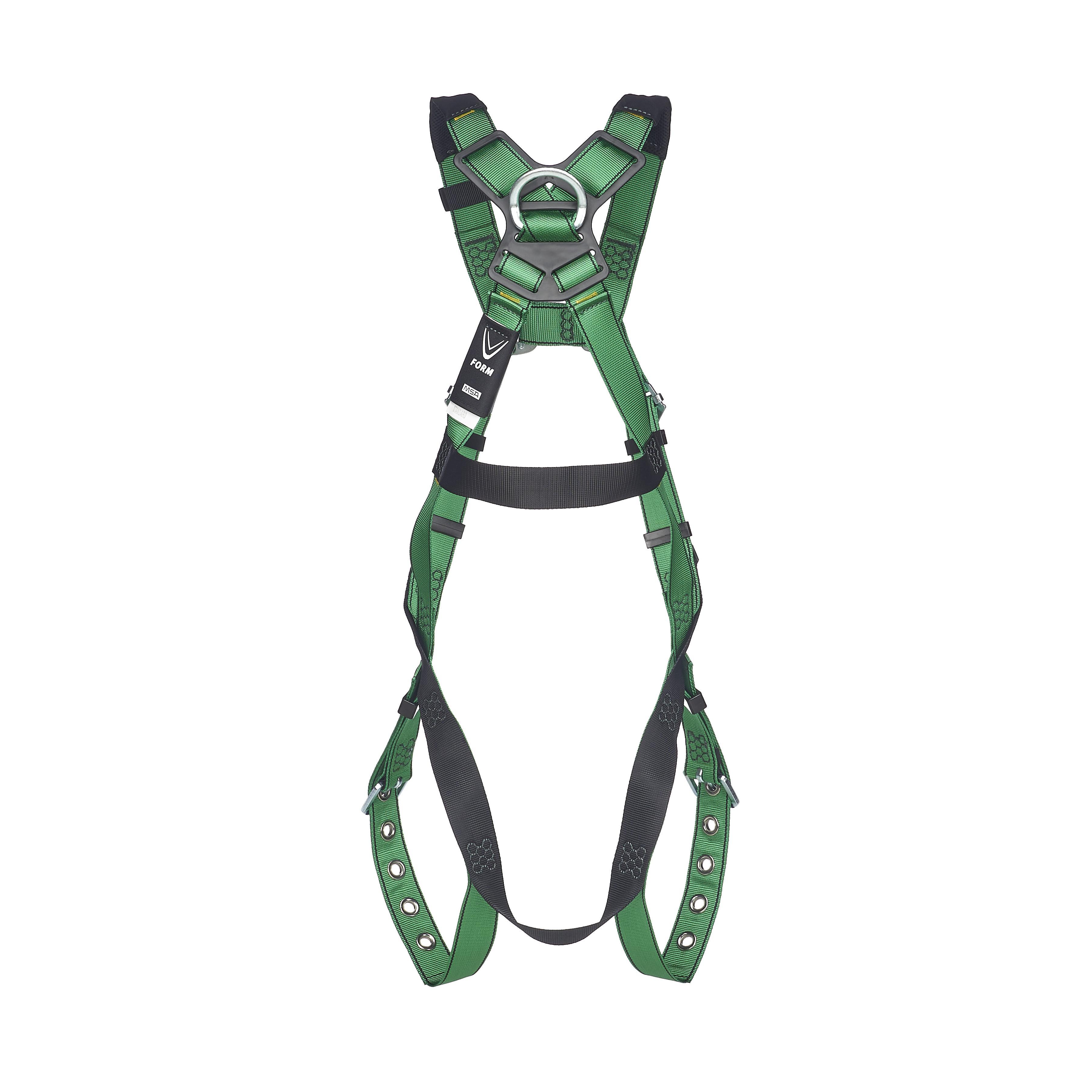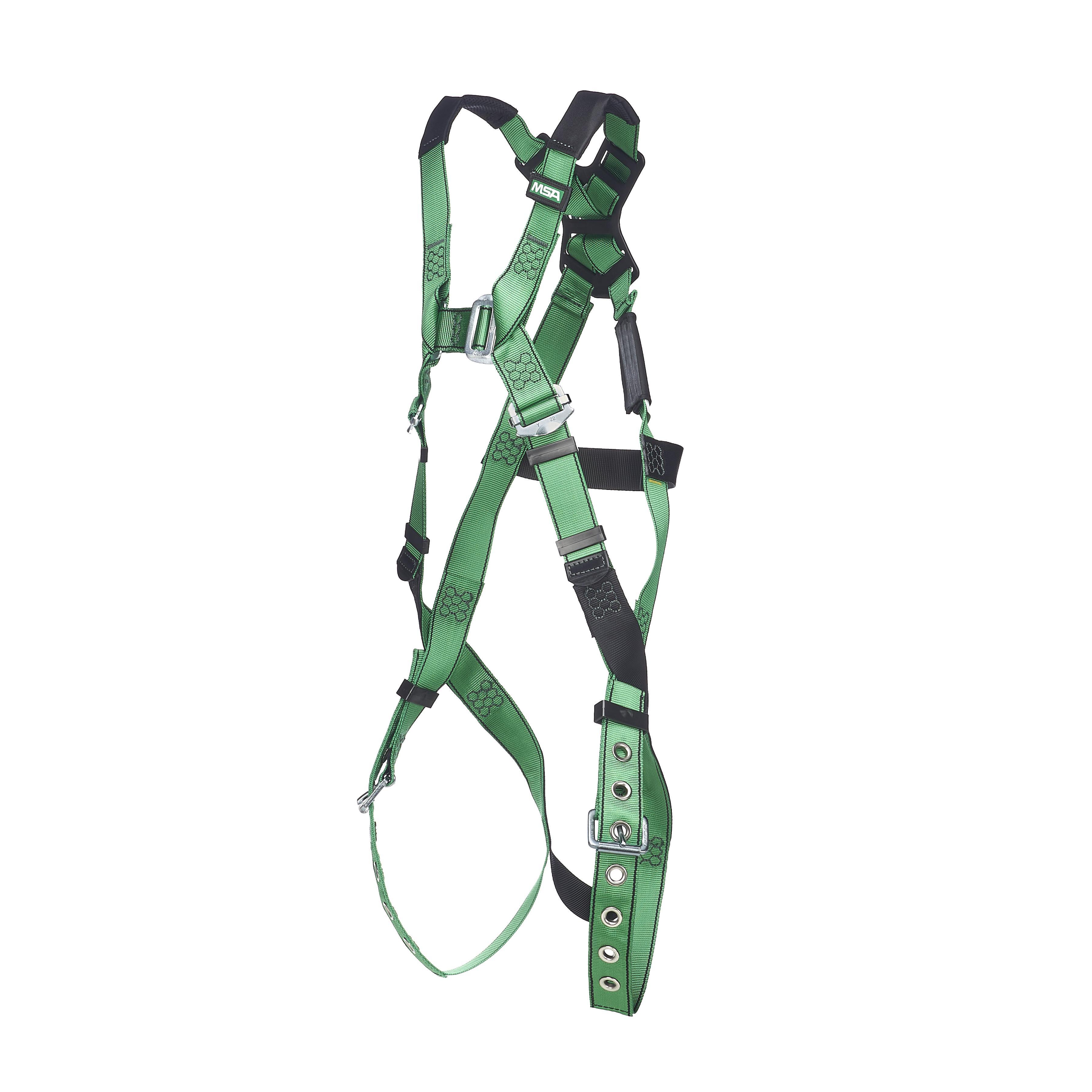 MSA V-FORM, 10206060, Safety Harness, Full Body, Super XL Size, 130 to 310 lb, 400 lb Load, Tongue Leg Strap Buckle, Quick-Connect Chest Strap Buckle, Polyester Strap, Racing Style, Stainless Steel/Steel Hardware, Green