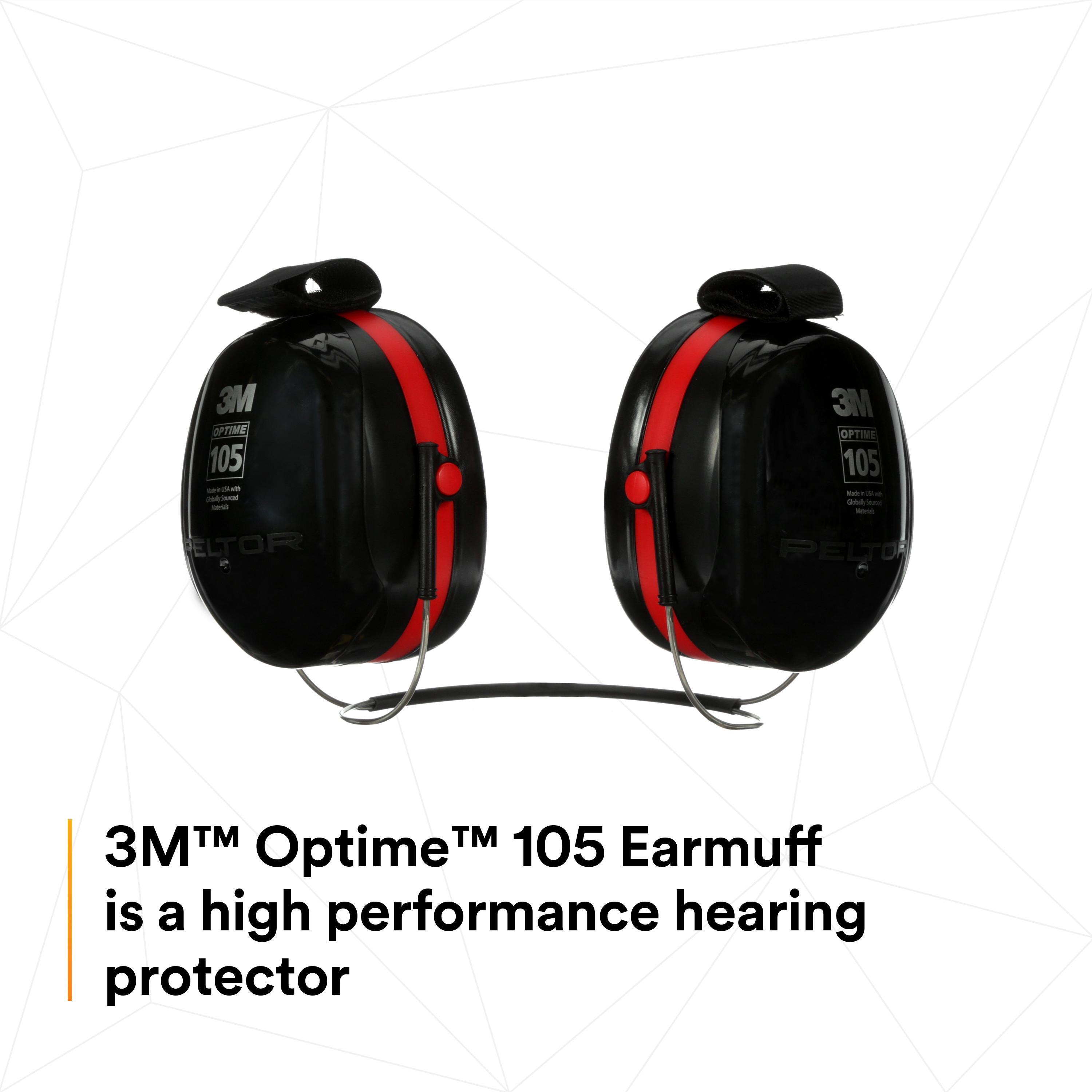 3M™ PELTOR™ Optime™ 105 Earmuffs are a high performance hearing protector. Featuring a proprietary dual-cup design and soft, foam-filled cushions, these earmuffs provide high attenuation and outstanding comfort. Additionally, these earmuffs are available in a variety of attachment types, including over-the-head, hard hat, and behind the head.