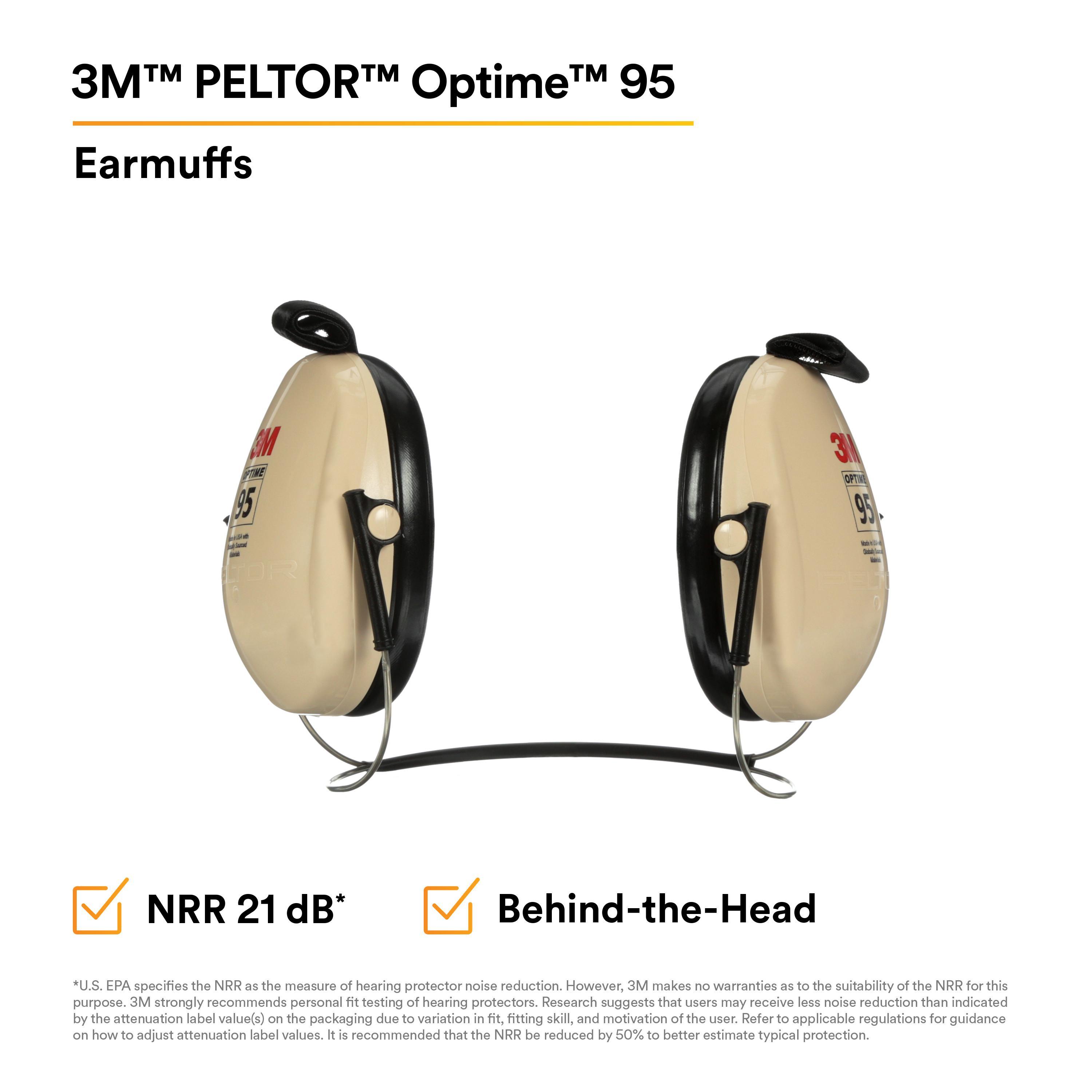 3M™ Peltor™ Optime™ 95 behind-the-head earmuffs feature low-profile earcups that fit well with most helmets, eyewear and other safety equipment. Provides effective hearing protection against high-frequency noise.