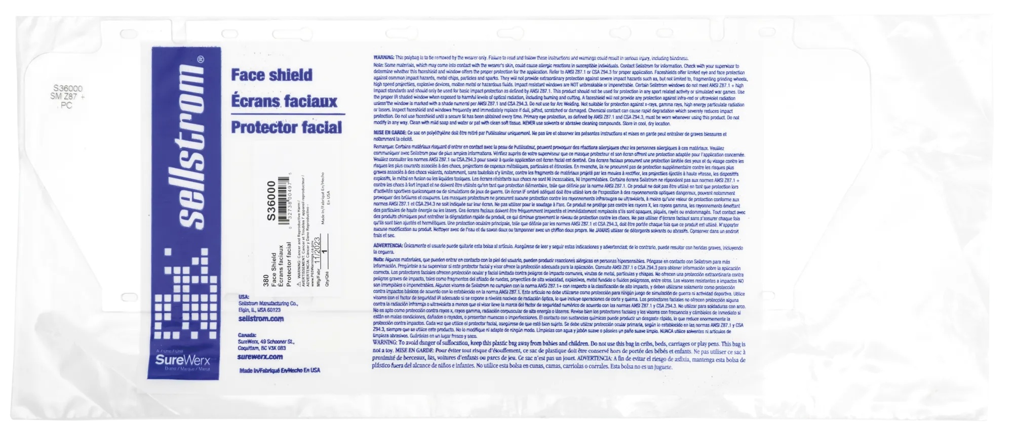 sellstrom® S36000 Replacement Face Shield Window, Clear, Acetate, 6-1/2 in H x 19-1/2 in W x 0.04 in THK Visor, For Use With 380 Series Face Shields, Uncoated Lens Shade