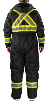 - The coverall has a zipper storm fly front with hidden snap closure and detachable insulated hood with knit wind seal and throat guard.