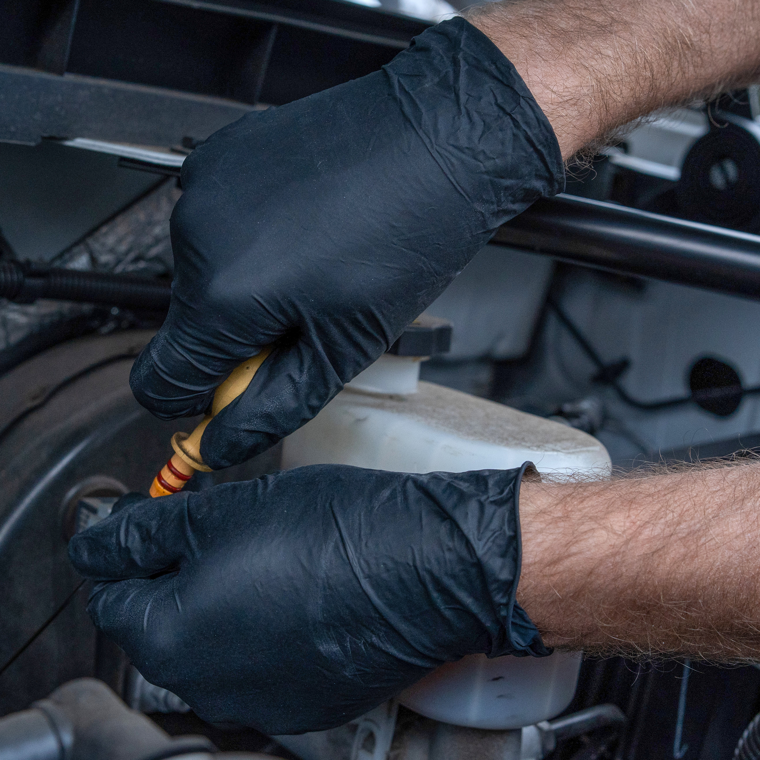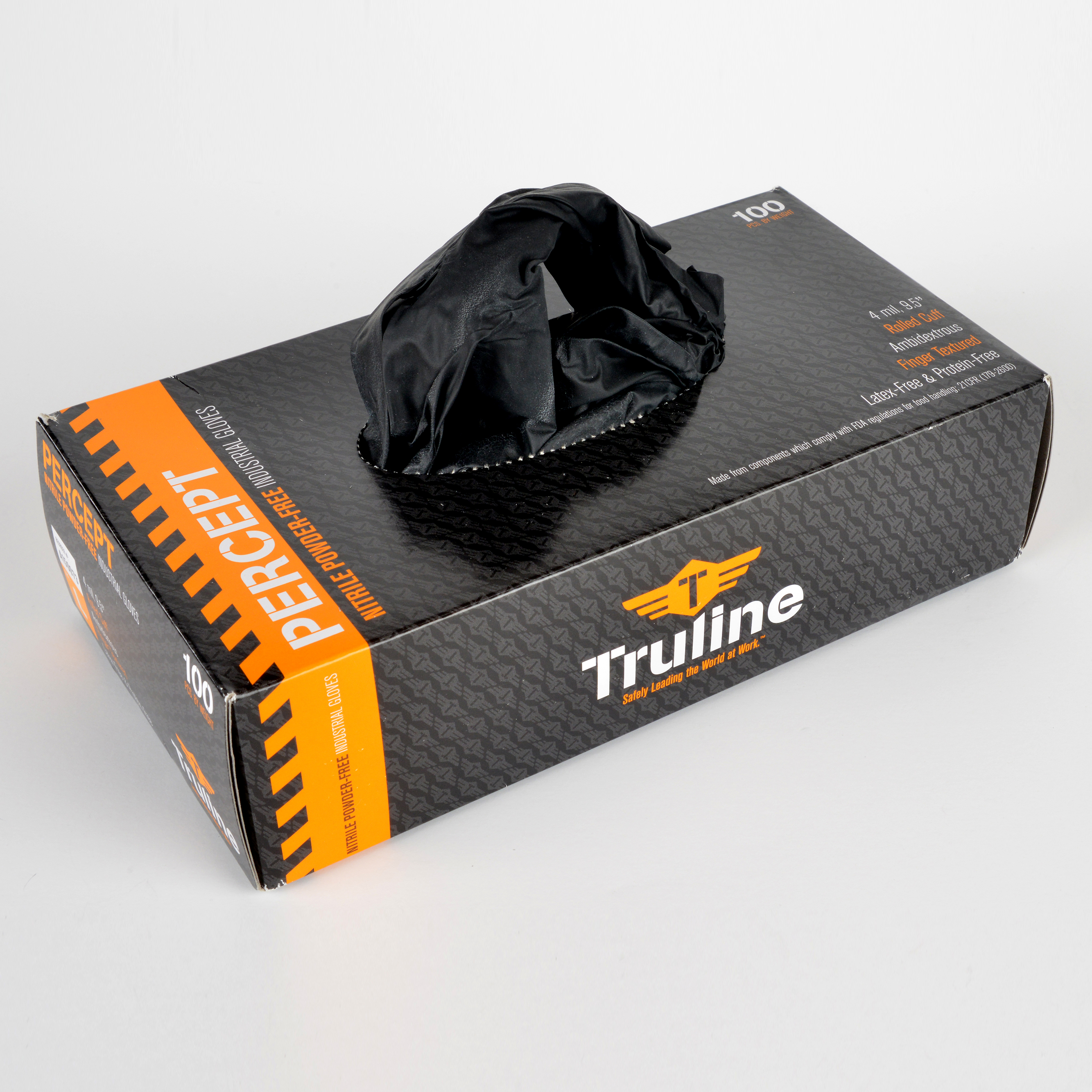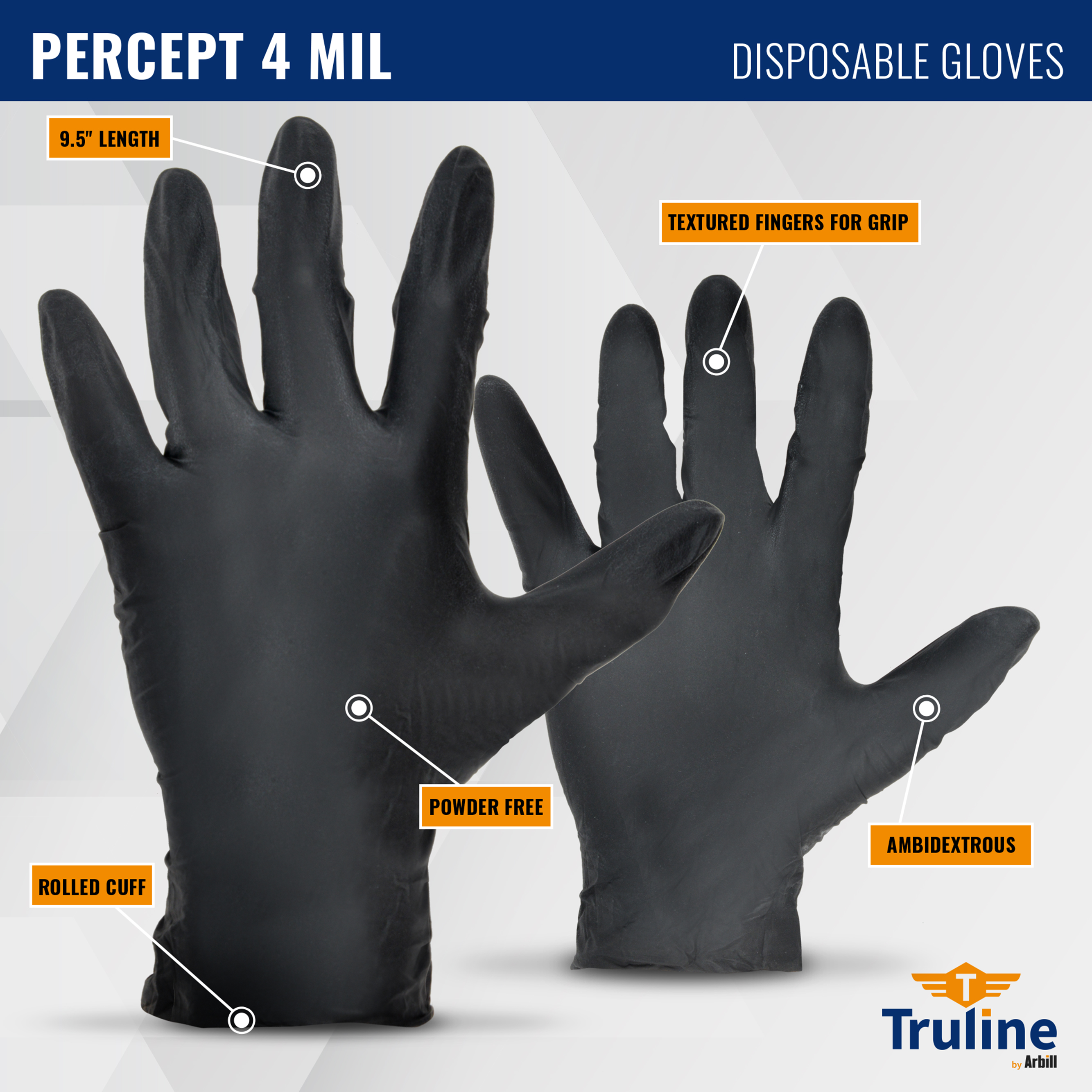 The Truline Percept 4 Mil 9.5" disposable glove is perfect for individuals who need comfort, durability, and dexterity. The black color helps to hide dirt, while the textured fingers provide a secure grip in both wet and dry applications. The powder-free glove also features a rolled cuff for ease of donning and has an ambidextrous design.