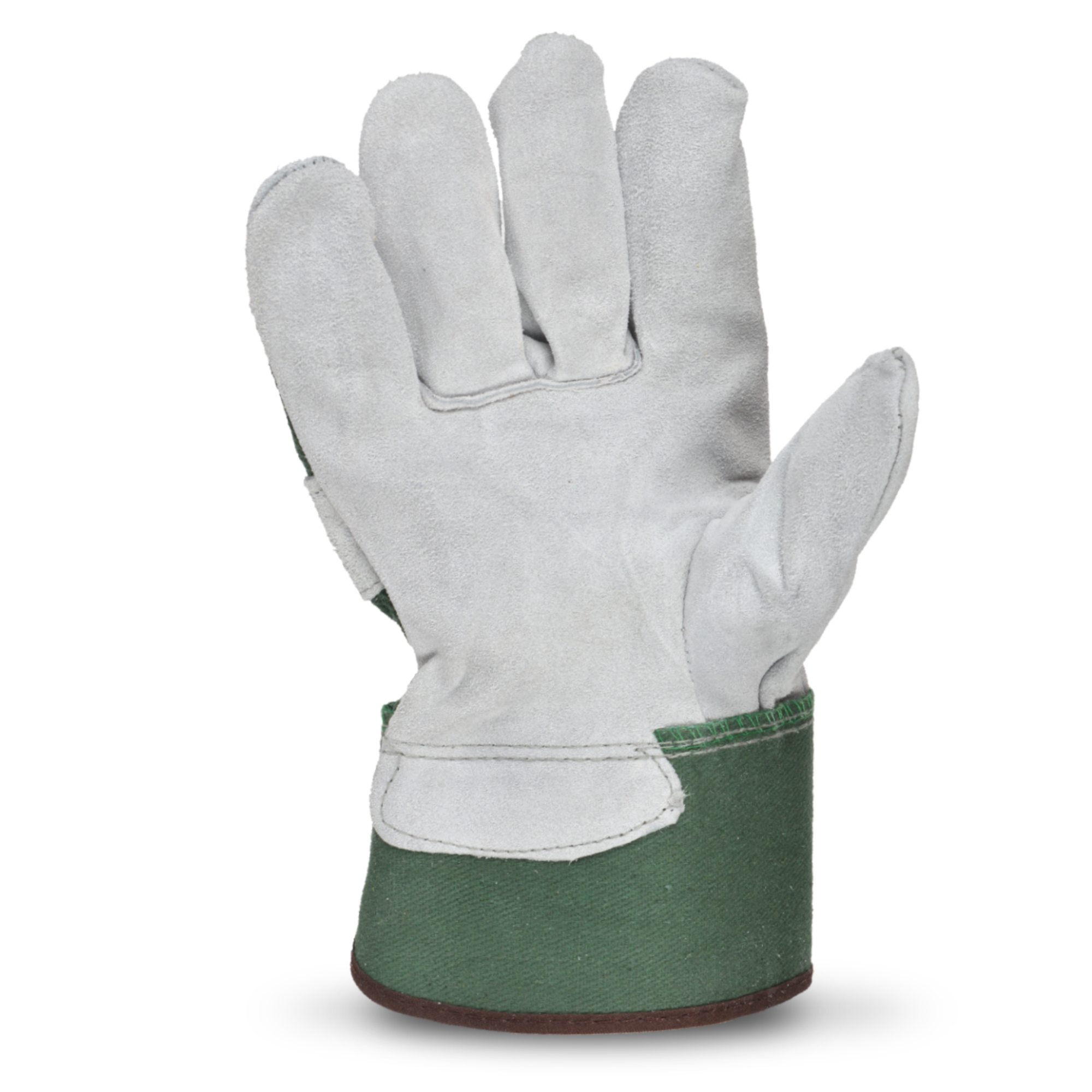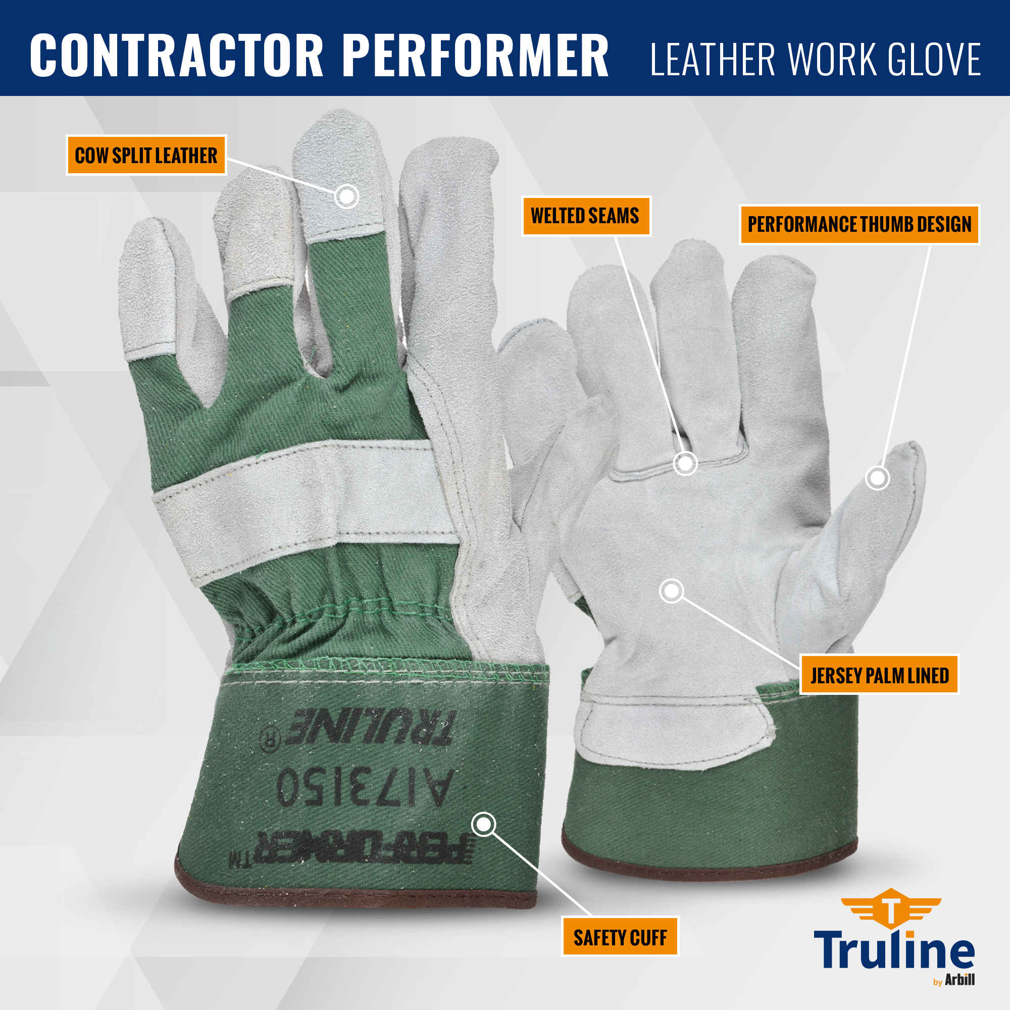 Crafted with a combination of split cowhide and cotton, the Truline Contractor Performer Leather Work Gloves offer excellent protection and comfort. It features welted seams, a shirred elastic back, and an enlarged knuckle strap. The jersey lined palm adds comfort while the polyethylene laminated cuff is designed to withstand multiple washings. The Performance Thumb eliminates the seams from wear areas to prolong the lifespan of the glove.